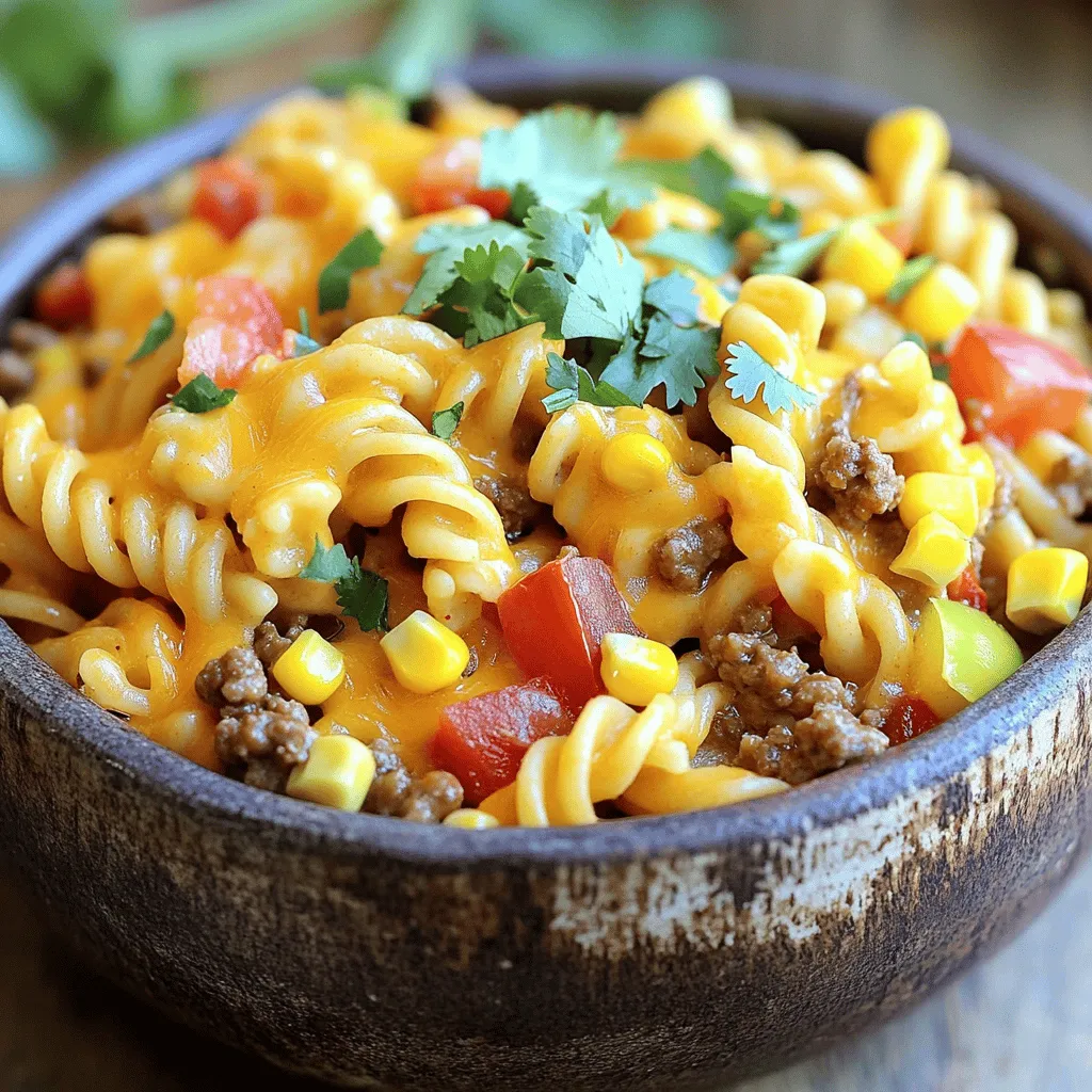![To make cheesy taco pasta, you’ll need: - 8 oz. pasta (your choice, such as penne or rotini) - 1 lb ground beef or turkey - 1 packet taco seasoning - 1 can (15 oz) diced tomatoes, with green chilies - 1 cup chicken broth or water - 1 cup shredded cheddar cheese - 1 cup shredded mozzarella cheese - 1 cup corn (canned or frozen) - 1/2 cup diced bell peppers (any color) - 1/2 cup diced onion - 2 tablespoons olive oil - Salt and pepper to taste - Fresh cilantro for garnish (optional) You can easily swap out ingredients to fit your needs. If you want a vegetarian dish, use black beans instead of meat. For gluten-free pasta, choose a gluten-free option. If you are lactose intolerant, try dairy-free cheese. Always check labels for allergens. To cook this dish, gather these kitchen tools: - A large pot for boiling pasta - A large skillet for sautéing and mixing - A spatula for stirring - Measuring cups and spoons - A colander for draining pasta - A sharp knife and cutting board for chopping veggies With these ingredients and tools, you are ready to make cheesy taco pasta! Check the Full Recipe for step-by-step instructions. To start, boil a large pot of water. Add salt to the water for flavor. Once boiling, add 8 oz. of pasta, like penne or rotini. Cook it according to the package instructions. You want the pasta to be al dente, which means it should still have a slight bite. After cooking, drain the pasta and set it aside. Next, grab a large skillet and heat 2 tablespoons of olive oil over medium heat. Once the oil is hot, add 1/2 cup of diced onion and 1/2 cup of diced bell peppers. Sauté these veggies until soft. This usually takes about 4-5 minutes. You want the onion to be translucent and fragrant. Now it’s time to add the protein. Put 1 lb of ground beef or turkey into the skillet. Cook the meat for about 6-8 minutes. Use a spatula to break it up as it cooks. Once browned, drain any excess fat. Then, sprinkle 1 packet of taco seasoning over the meat. Mix in a 15 oz can of diced tomatoes with green chilies and 1 cup of corn. Pour in 1 cup of chicken broth or water. Stir everything together and let it simmer for about 5 minutes. Now for the best part! Stir the cooked pasta into the skillet with the meat and veggies. Toss everything well to combine. Then, add 1 cup of shredded cheddar cheese and 1 cup of shredded mozzarella cheese. Keep stirring until the cheese melts into a creamy sauce. If it gets too thick, add a little more chicken broth or water. Taste it and adjust the seasoning with salt and pepper if needed. Finally, spoon the cheesy taco pasta into bowls. You can garnish it with fresh cilantro for extra flavor. Enjoy your meal! For the Full Recipe, check the complete instructions above. To get the best pasta, pay attention to cook time. Use salted water for boiling. This adds flavor right from the start. Cook the pasta until it is "al dente." This means it should be firm but not hard. If you cook it too long, it gets mushy. After draining, toss the pasta with a little olive oil. This keeps it from sticking together. Seasoning makes your dish pop. I always use taco seasoning for that classic flavor. You can adjust the amount to your taste. Add more for a spicier kick or less for a milder taste. Diced tomatoes with green chilies also add a nice zing. Don’t forget to taste as you cook. This helps you find the perfect balance of flavors. For a creamy texture, use a mix of cheeses. I love cheddar and mozzarella together. They melt well and create a rich sauce. Stir the cheese in slowly, and keep the heat low. This way, the cheese melts evenly. If it gets too thick, add a splash of chicken broth or water. This helps keep everything smooth and creamy. {{image_2}} You can easily make a vegetarian version of cheesy taco pasta. Use plant-based meat or skip it altogether. Replace the ground beef with black beans or lentils. These options add protein and flavor. You can also add more vegetables like zucchini or mushrooms for extra texture. The rest of the recipe stays the same, giving you a hearty dish without meat. If you prefer different meats, there are plenty of choices. Ground turkey is lean and tasty. You can use chicken, too. If you want a bold flavor, try chorizo. Just remember to adjust cooking times based on the meat you choose. Each option brings its unique taste, so feel free to experiment. Get creative with add-ins and toppings! You can mix in beans, avocado, or even spinach for added nutrition. Top it off with sour cream or guacamole for a creamy touch. Fresh salsa or jalapeños can add some heat. Don't forget to sprinkle cilantro for a burst of color and flavor. These little extras can make your cheesy taco pasta even more delicious. For the complete recipe, check the [Full Recipe]. To store your cheesy taco pasta, let it cool first. Then, place it in an airtight container. It will stay fresh in the fridge for up to three days. If you want to keep it longer, consider freezing it. When you reheat the pasta, use a microwave or stove. If using a microwave, cover the bowl loosely with a lid or wrap. Heat it for one to two minutes. Stir it halfway to ensure even heating. If it’s on the stove, add a splash of broth or water. This helps keep it creamy. To freeze, use a freezer-safe container. You can freeze it for up to three months. When ready to eat, thaw it in the fridge overnight. Then, reheat it as described above. This keeps the flavors intact and ensures a tasty meal. For the full recipe, check out the earlier sections. Cheesy Taco Pasta lasts about 3 to 5 days in the fridge. Make sure to store it in an airtight container. This keeps it fresh and tasty. When you are ready to eat, just reheat it on the stove or in the microwave. Yes, you can make Cheesy Taco Pasta ahead of time. It’s perfect for meal prep! Cook it, let it cool, and store it in the fridge. When you are ready to eat, just reheat it. The flavors will blend even more while it sits. You can serve Cheesy Ta
